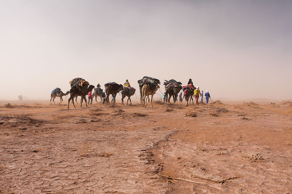 Am nächsten Tag startet unser Karawanentrekking: Wir ziehen mit Nomaden und Dromedaren durch die Wüste – Schritt für Schritt, in einem langsamen Rhythmus.